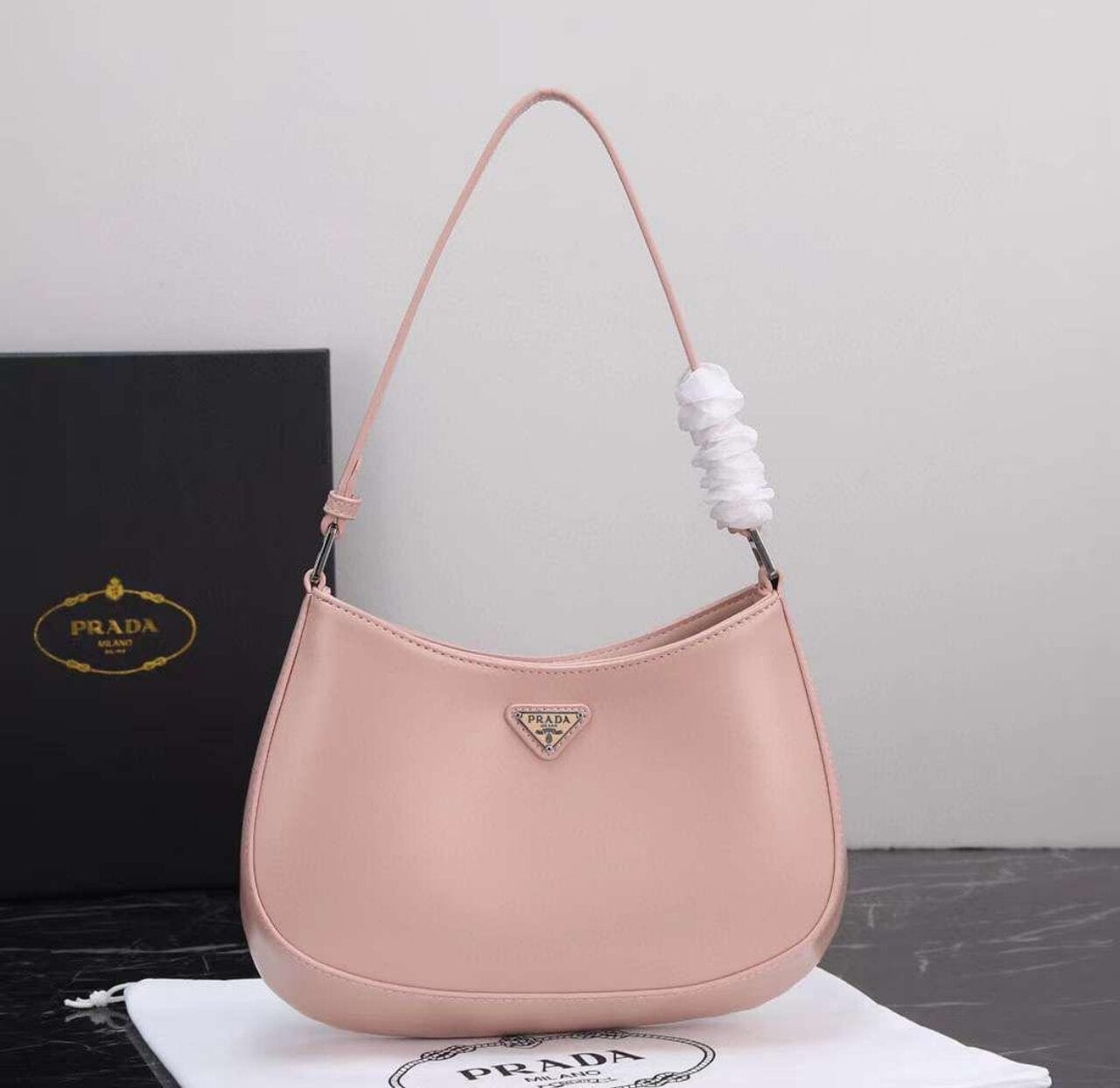 - Displayed on a white Prada dust cloth, with a black Prada box marked “MILANO” in gold—ideal for gifting or showcasing.